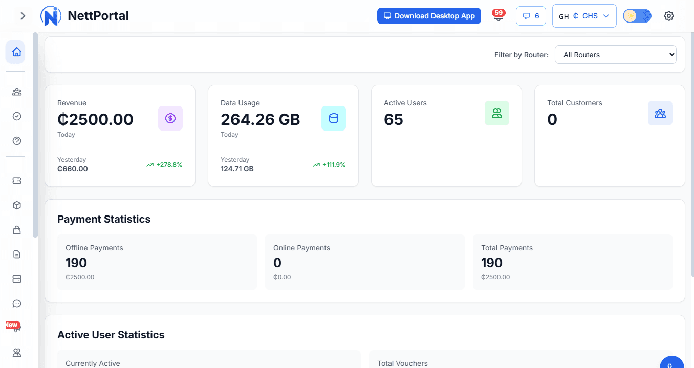 Everything you need to run your ISP business is included. Unlimited customers, routers, vouchers, packages, and access to all features. As your business grows, you keep more of your revenue.